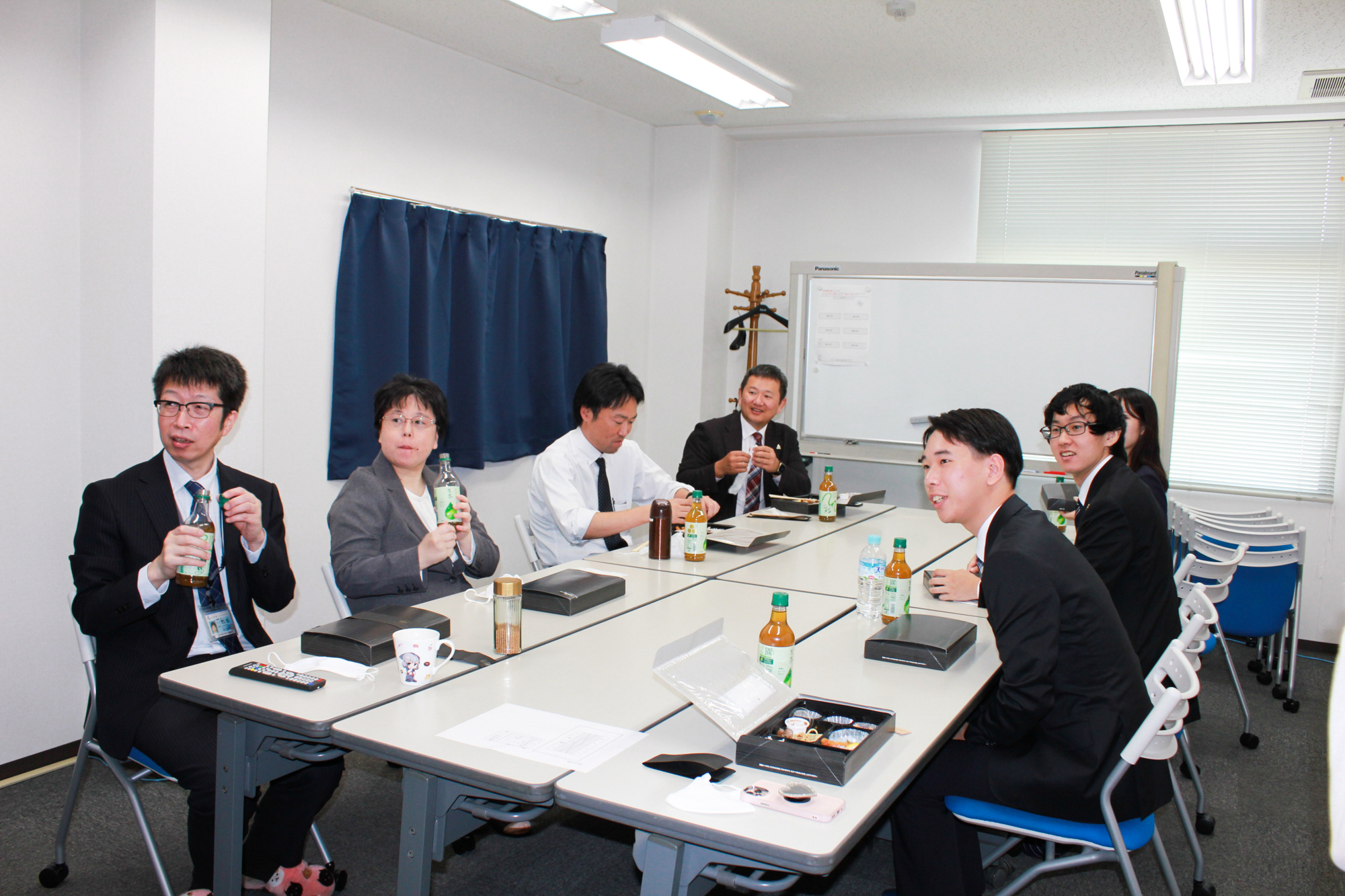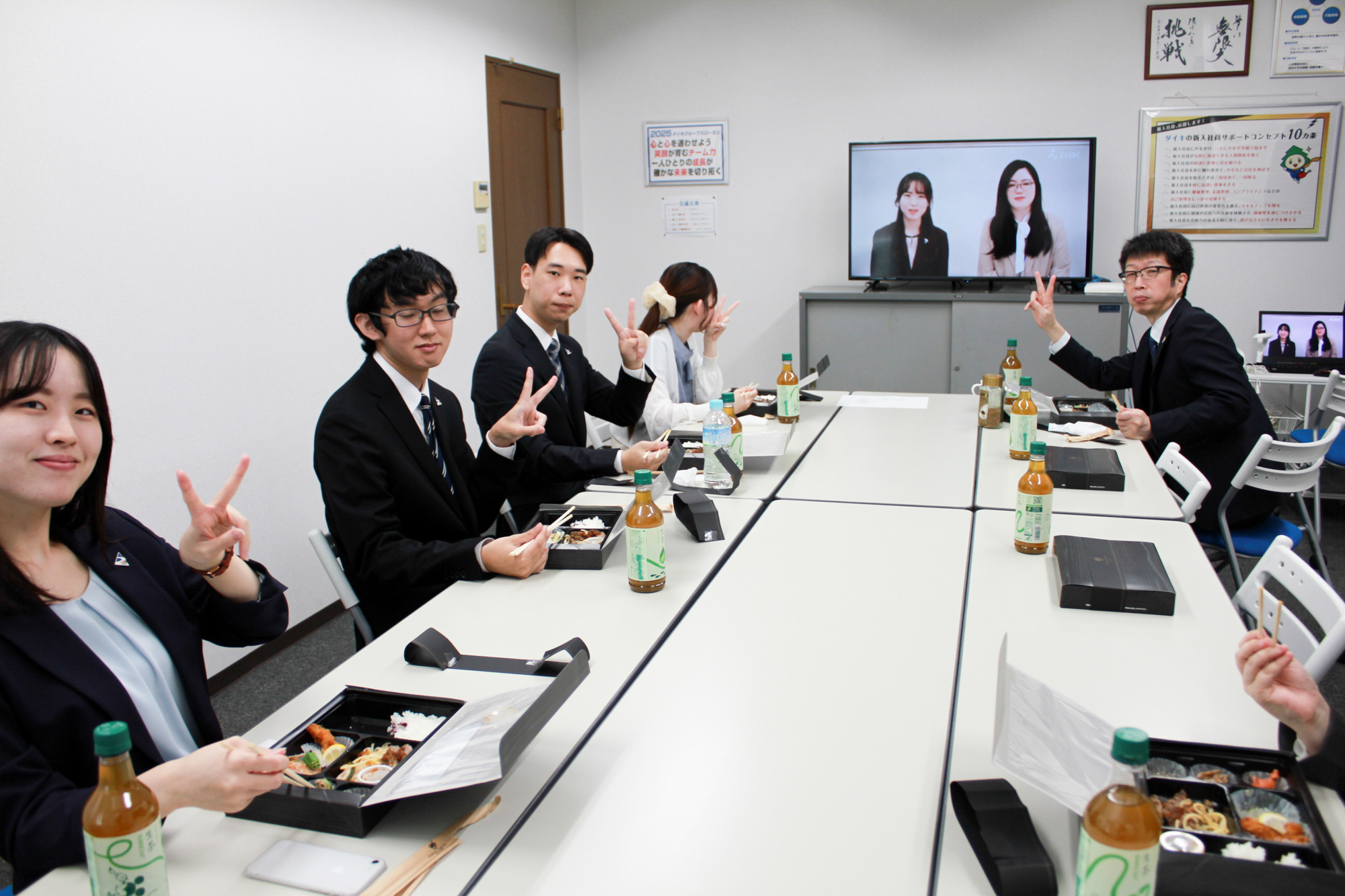 式典終了後には、歓迎の気持ちを込めて新入社員との食事会が催されました。食事会場では、ダイキグループの全国各拠点および各部署から寄せられたお祝いのビデオメッセージが上映され、温かい言葉の数々が新入社員を包みました。終始和やかな雰囲気の中で交流が深まりました。